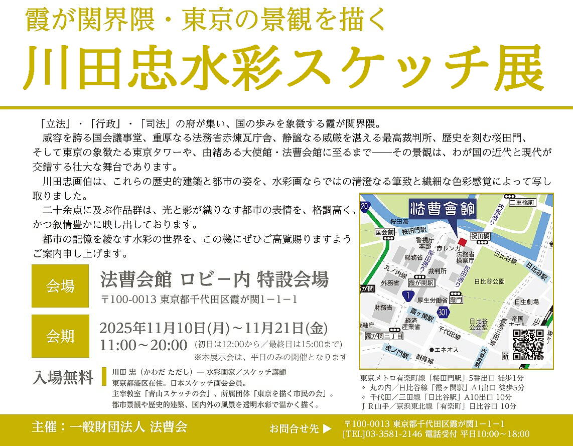 【11/10~11/21】川田 忠 水彩スケッチ展 / 法曹会館 ロビー内 特設会場(霞が関)