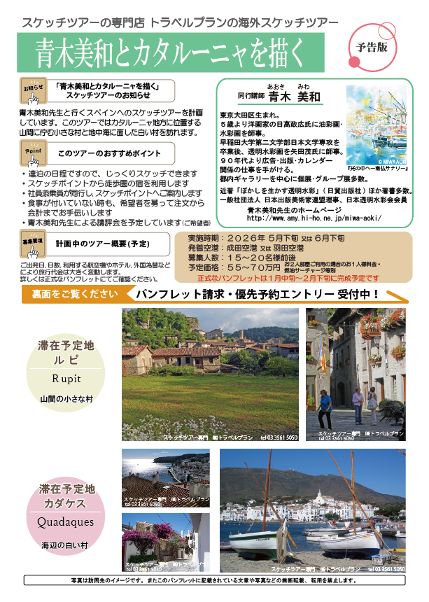 2026年5下旬または6月下旬頃に、青木美和先生とスペイン・カタルーニャ地方へのスケッチ旅行を計画中です。