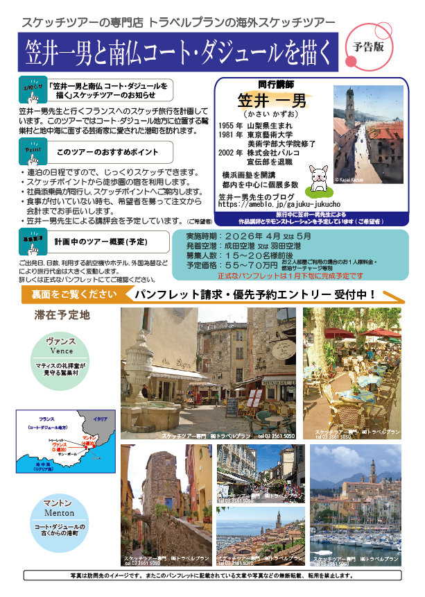 2026年4月または5月に、笠井一男先生と南フランスのコート・ダジュール地方へのスケッチ旅行を計画中です。