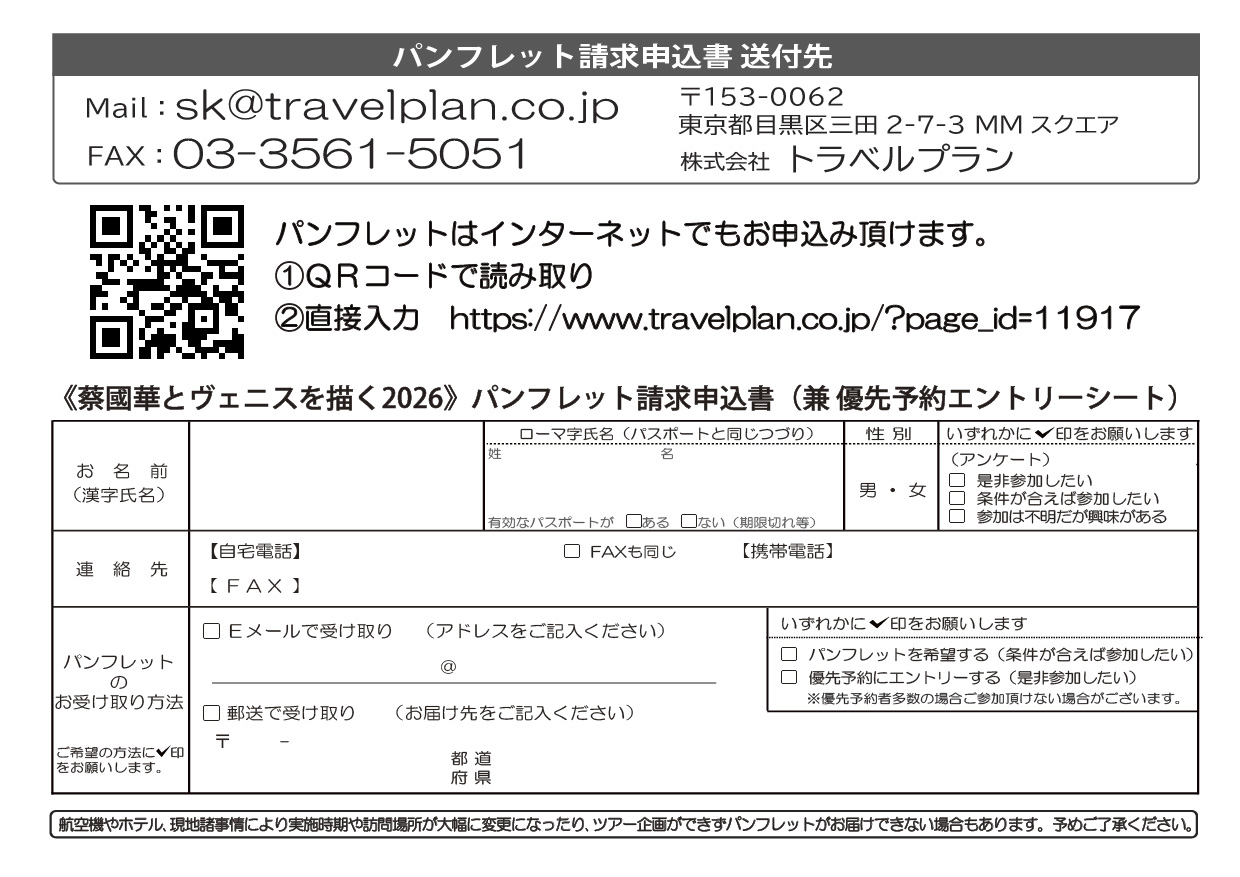 ※航空機やホテル、現地諸事情により実施時期や訪問場所(ヴェニスではなく、他のヨーロッパの国や地域)が大幅に変更される場合がございます。予め、ご了承ください。