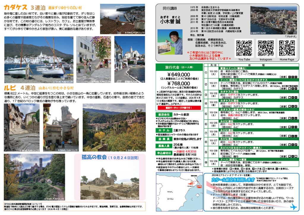 【小木曽誠とカタルーニャの美しい村々を描く】募集のお知らせ 2026年10月20日出発 10日間